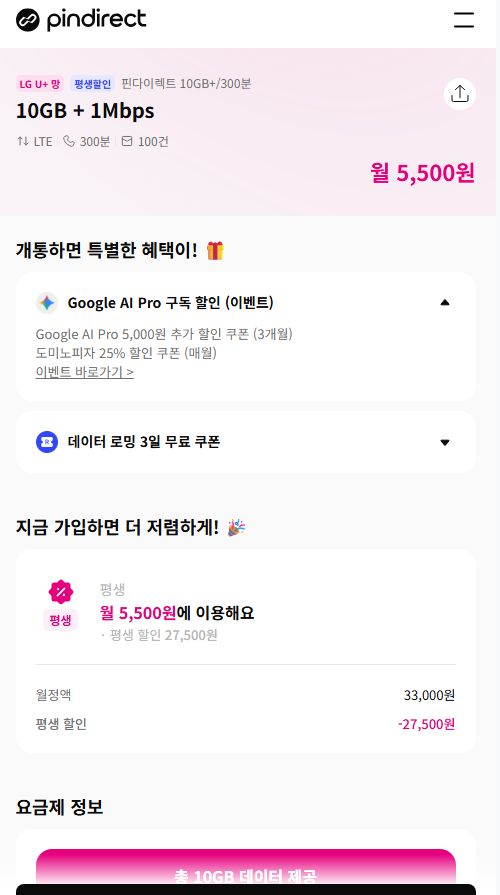 상품명핀다이렉트 LG망 평생요금제 5500원 10GB+1MBPS 통화100분